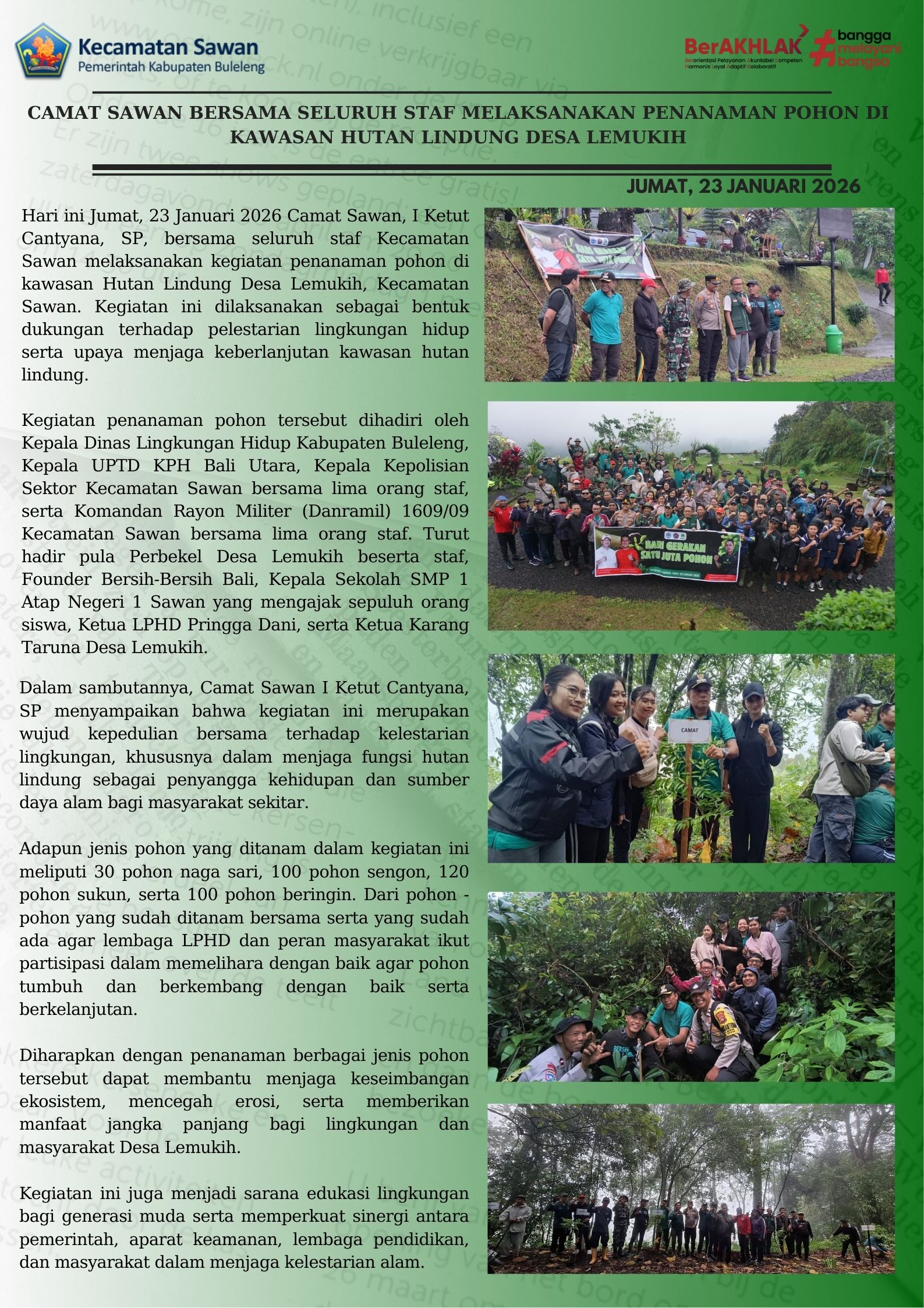 Hari ini Jumat, 23 Januari 2026 Camat Sawan, I Ketut Cantyana, SP, bersama seluruh staf Kecamatan Sawan melaksanakan kegiatan penanaman pohon di kawasan Hutan Lindung Desa Lemukih, Kecamatan Sawan. Kegiatan ini dilaksanakan sebagai bentuk dukungan terhadap pelestarian lingkungan hidup serta upaya menjaga keberlanjutan kawasan hutan lindung.