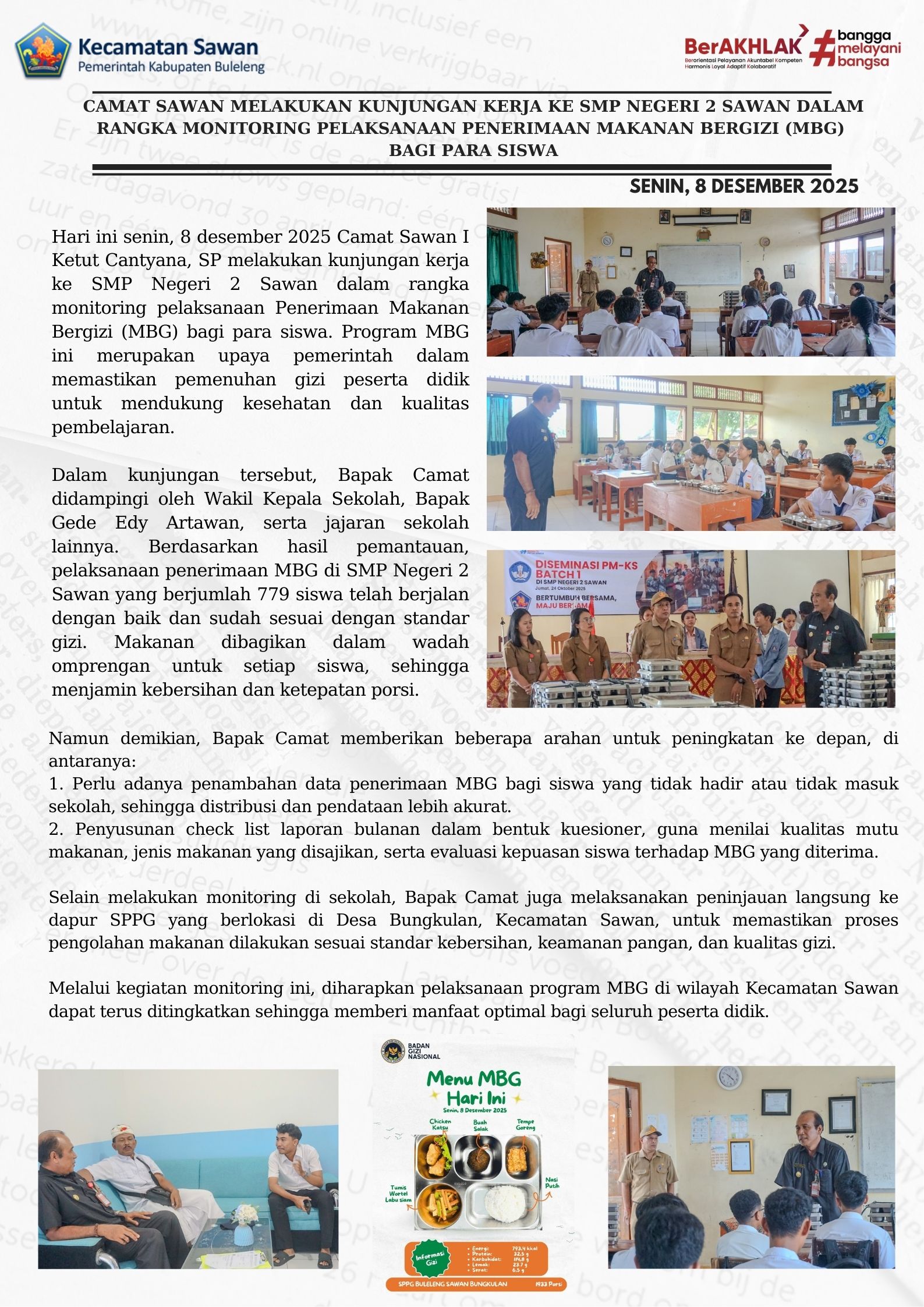 Hari ini senin, 8 desember 2025 Camat Sawan I Ketut Cantyana, SP melakukan kunjungan kerja ke SMP Negeri 2 Sawan dalam rangka monitoring pelaksanaan Penerimaan Makanan Bergizi (MBG) bagi para siswa. Program MBG ini merupakan upaya pemerintah dalam memastikan pemenuhan gizi peserta didik untuk mendukung kesehatan dan kualitas pembelajaran.