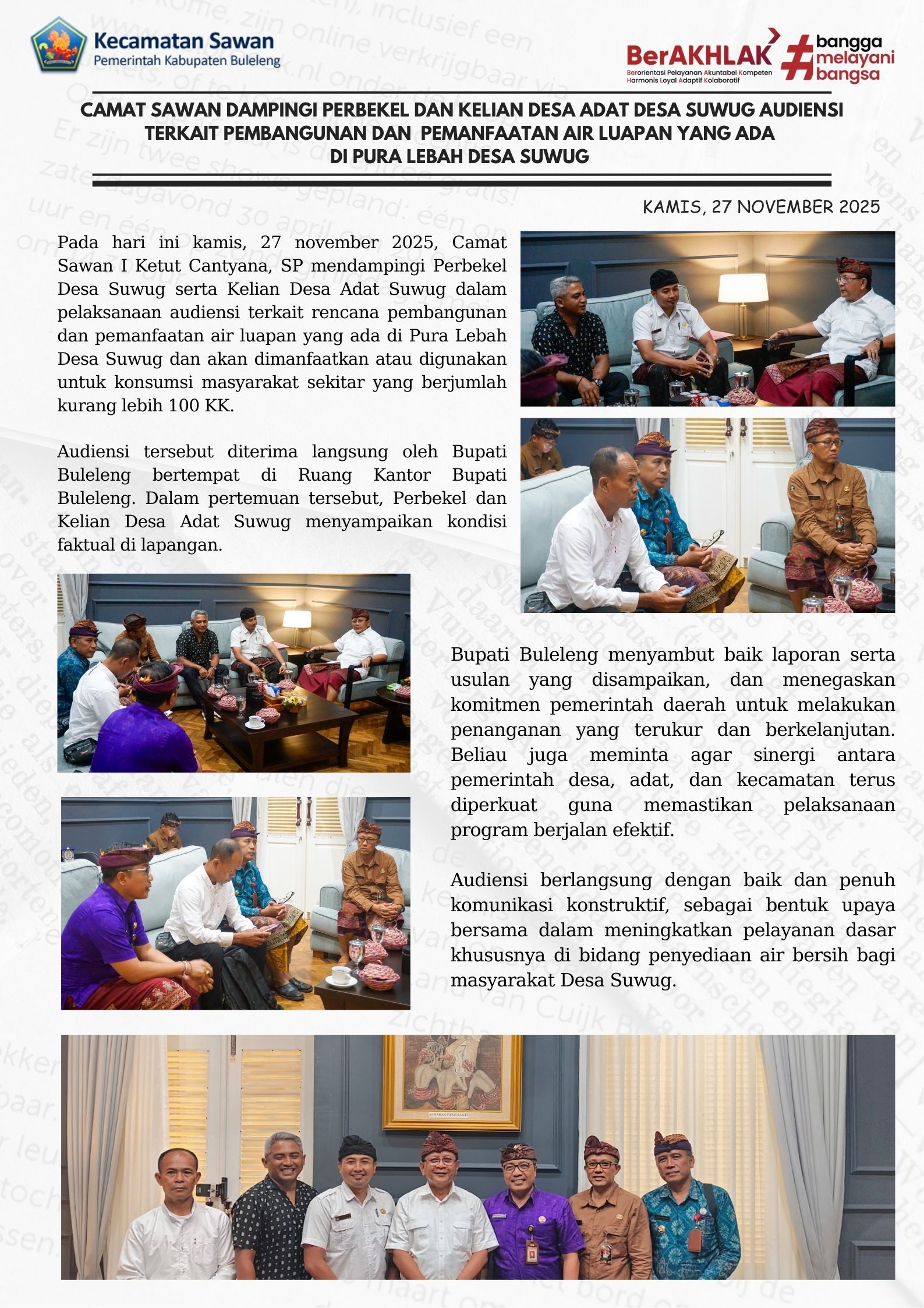 Pada hari ini kamis, 27 november 2025, Camat Sawan I Ketut Cantyana, SP mendampingi Perbekel Desa Suwug serta Kelian Desa Adat Suwug dalam pelaksanaan audiensi terkait rencana pembangunan dan pemanfaatan air luapan yang ada di Pura Lebah Desa Suwug dan akan dimanfaatkan atau digunakan untuk konsumsi masyarakat sekitar yang berjumlah kurang lebih 100 KK.