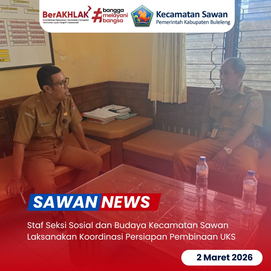 Hari ini senin, 2 maret 2026 dalam rangka persiapan pelaksanaan pembinaan Usaha Kesehatan Sekolah (UKS), staf Seksi Sosial dan Budaya Kecamatan Sawan melaksanakan kegiatan koordinasi ke SD N 3 Menyali dan SMP N 1 Sawan pada hari ini.