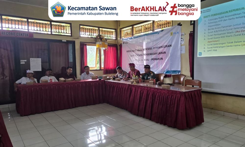 Hari ini kamis, 27 november 2025 Kasi Pembangunan Kecamatan Sawan Wayan Mahayasa, S.Sos mendampingi sosialisasi awal rencana pembebasan lahan SUTT 150 KV KUBU-PEMARON ( PT PLN UPP JBTB 4.) yang bertempat di Aula Kantor Camat Sawan.