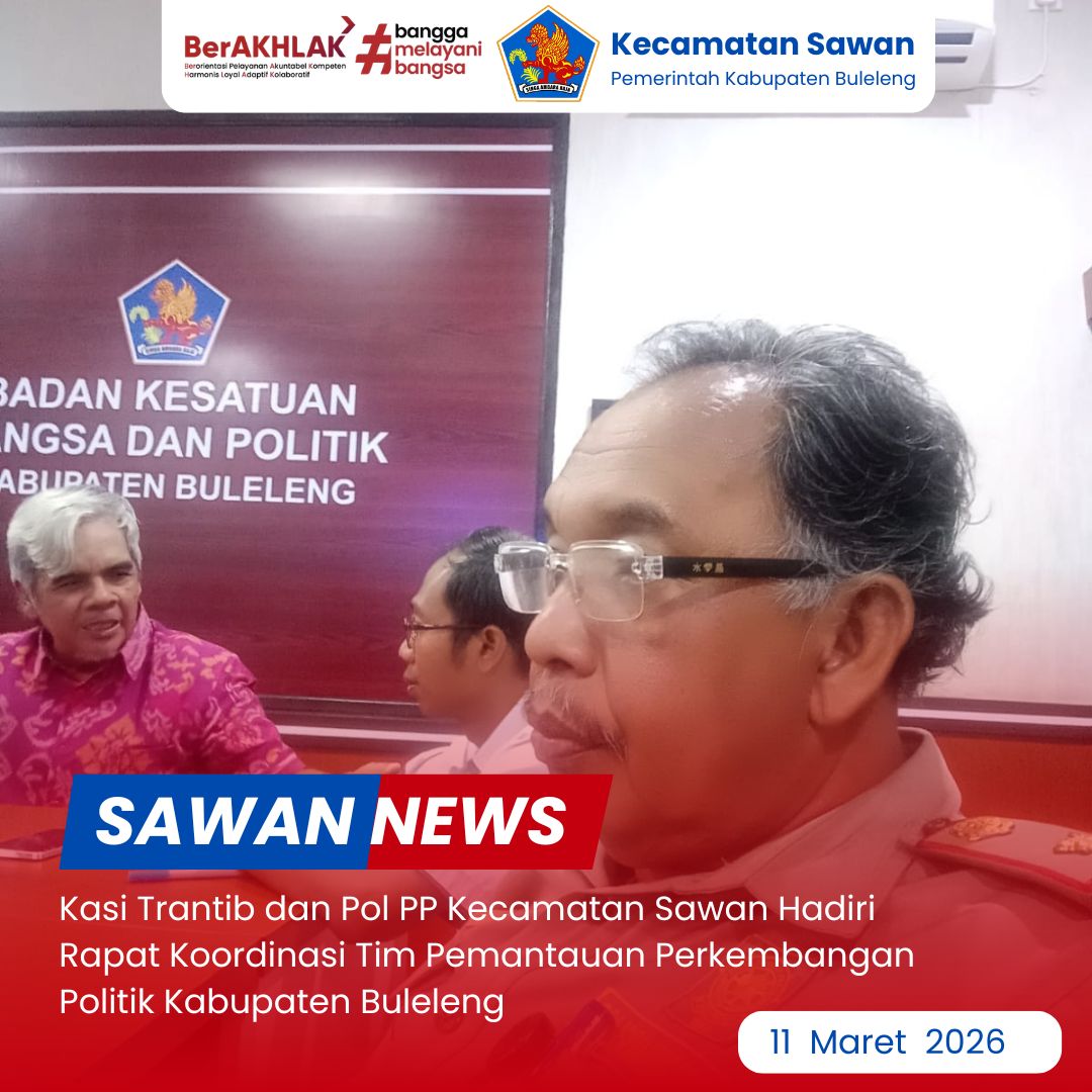 Hari ini Rabu, 11 Maret 2026, Kasi Trantib dan Pol PP Kecamatan Sawan, Made Sutiastawa, SH menghadiri Rapat Koordinasi Tim Pemantauan Perkembangan Politik Kabupaten Buleleng yang dilaksanakan di Kabupaten Buleleng.