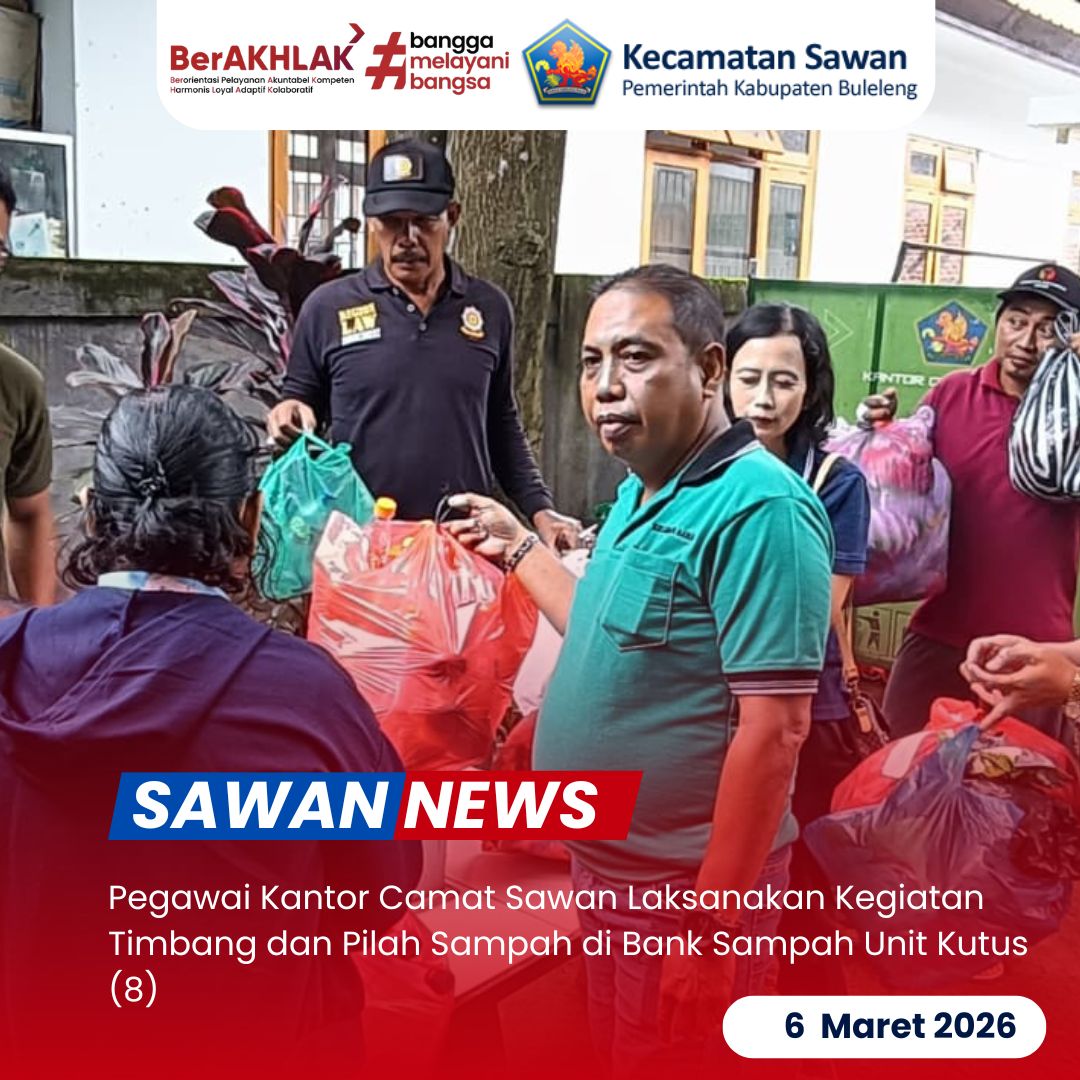 Hari ini Jumat, 6 Maret 2026, seluruh pegawai Kantor Camat Sawan melaksanakan kegiatan timbang dan pilah sampah di Bank Sampah Unit (BSU) Kutus (8) Kantor Camat Sawan. Kegiatan ini merupakan bagian dari upaya meningkatkan kepedulian terhadap kebersihan lingkungan sekaligus mendukung pengelolaan sampah yang lebih baik.
