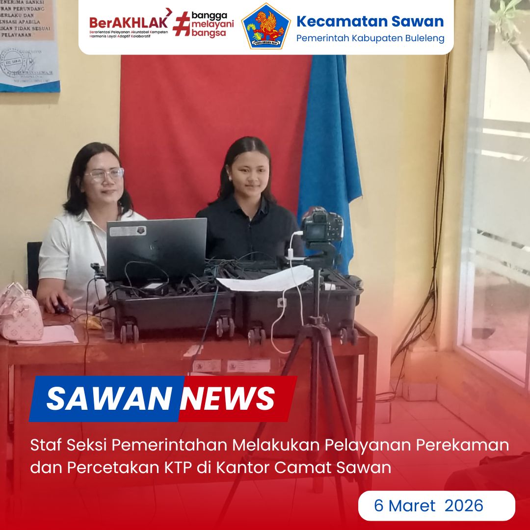 Hari ini Jumat, 6 Maret 2026, staf Kantor Camat Sawan melaksanakan kegiatan perekaman dan percetakan Kartu Tanda Penduduk (KTP) yang bertempat di Kantor Camat Sawan.