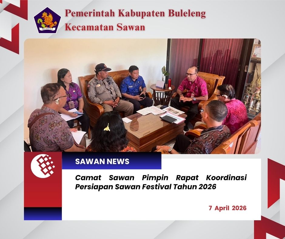 Hari ini Selasa, 7 April 2026, Camat Sawan I Ketut Cantyana, SP didampingi Sekretaris Camat Sawan Gde Agus Ngurah Suryawan, S.Sos melaksanakan rapat koordinasi terkait persiapan Sawan Festival Tahun 2026 yang bertempat di Ruangan Camat Sawan.
