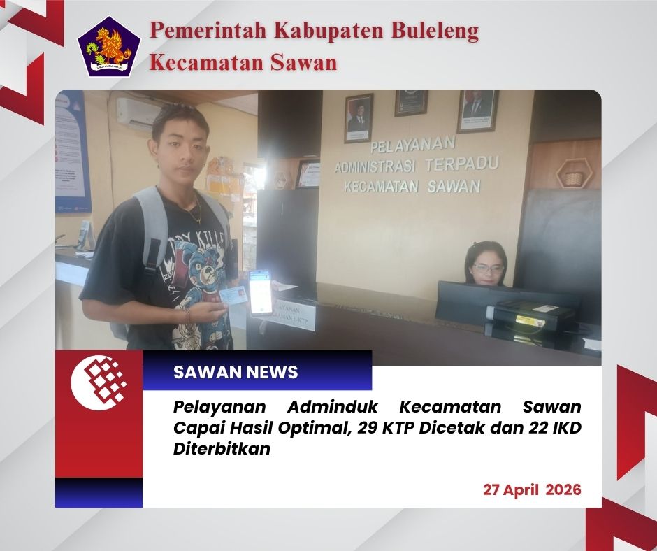 Hari ini Senin, 27 April 2026, staf Kantor Camat Sawan melaksanakan pelayanan administrasi kependudukan yang meliputi perekaman, percetakan KTP elektronik, serta pembuatan Identitas Kependudukan Digital (IKD). Kegiatan ini berlangsung di Kantor Camat Sawan dengan tujuan meningkatkan kualitas pelayanan kepada masyarakat.