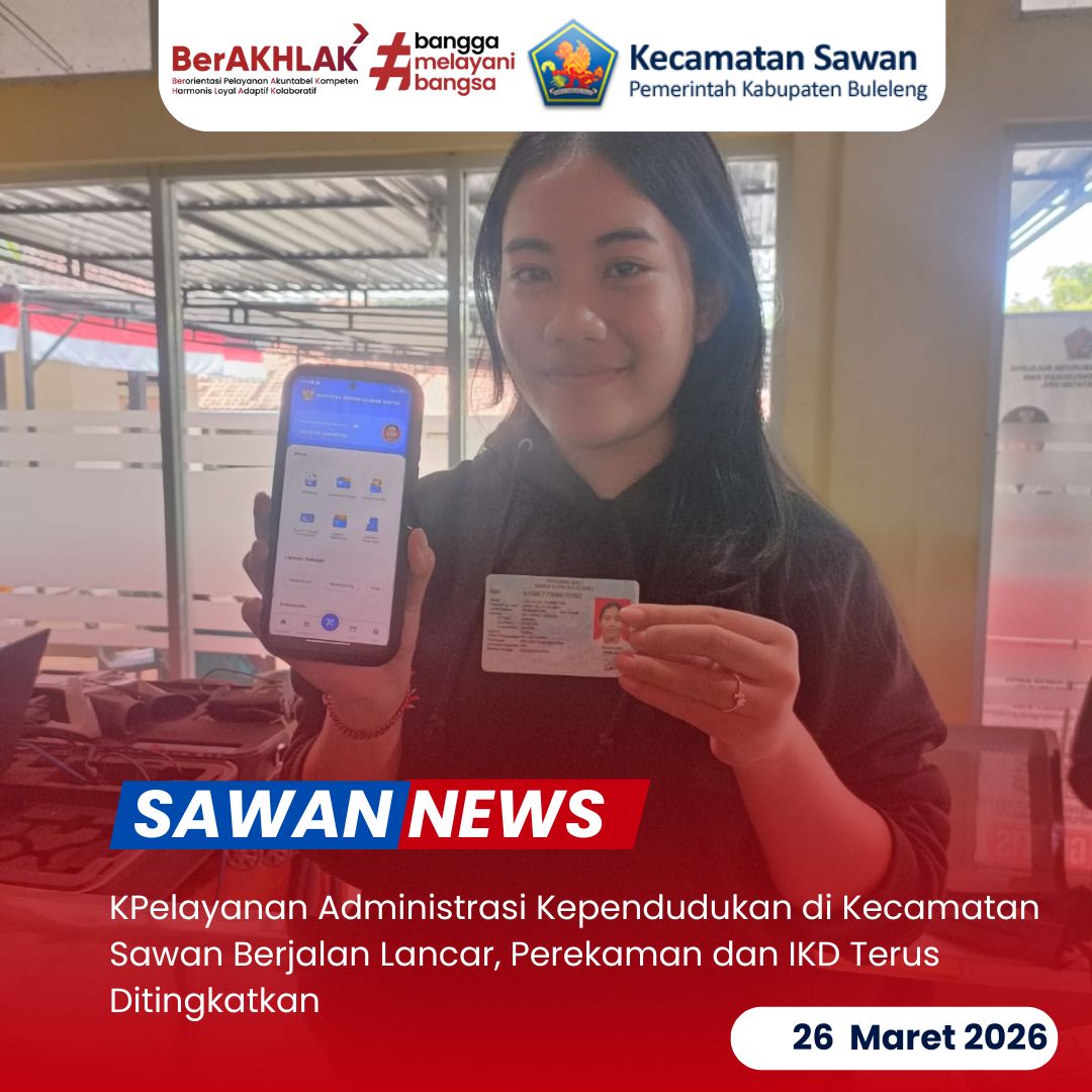 Hari ini Kamis, 26 Maret 2026, staf Kantor Camat Sawan kembali melaksanakan kegiatan pelayanan administrasi kependudukan berupa perekaman dan percetakan KTP Elektronik (KTP-El) serta pembuatan Identitas Kependudukan Digital (IKD). Kegiatan ini merupakan upaya berkelanjutan dalam meningkatkan kualitas pelayanan publik kepada masyarakat.