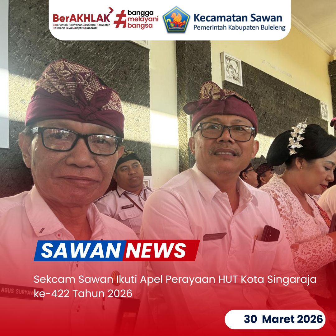 Hari ini Senin, 30 Maret 2026, Sekretaris Camat (Sekcam) Sawan, Gde Agus Ngurah Suryawan, S.Sos, mengikuti apel perayaan Hari Ulang Tahun (HUT) Kota Singaraja ke-422 yang dilaksanakan di Lapangan Ngurah Rai.