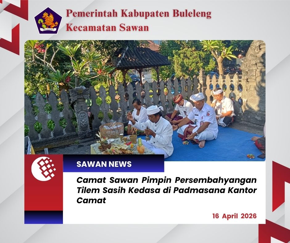 Hari ini Kamis, 16 April 2026 yang bertepatan dengan rahina Tilem Sasih Kedasa, Camat Sawan I Ketut Cantyana, SP didampingi Sekretaris Camat (Sekcam) Sawan Gde Agus Ngurah Suryawan, S.Sos melaksanakan persembahyangan bersama di Padmasana Kantor Camat Sawan.