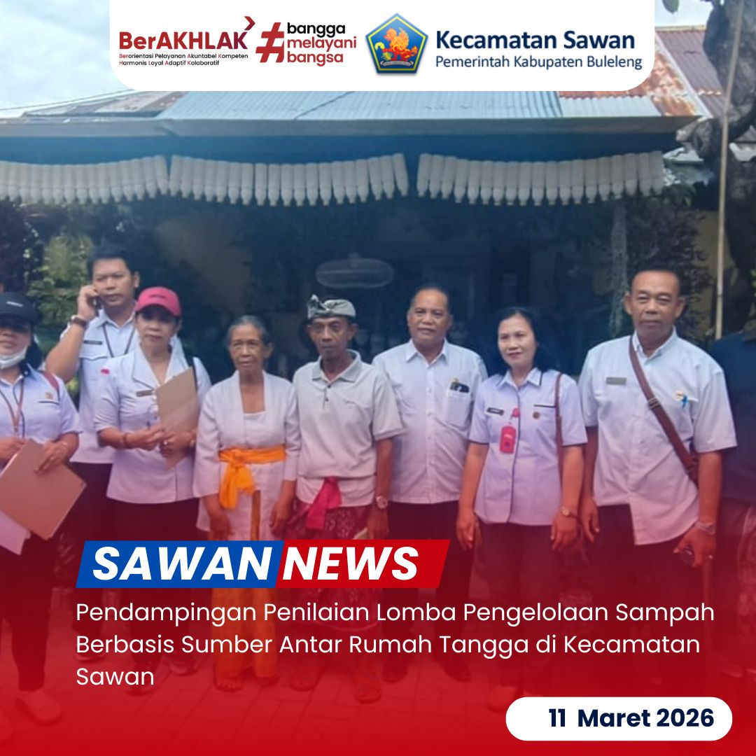 Hari ini Rabu 11 Maret 2026 Menindaklanjuti surat dari Kepala Dinas Lingkungan Hidup Kabupaten Buleleng terkait pelaksanaan Lomba Pengelolaan Sampah Berbasis Sumber (PSBS) Antar Rumah Tangga Tahun 2026 dalam rangka memperingati Hari Ulang Tahun (HUT) Kota Singaraja ke-422, Ketua Tim Lomba PSBS Kecamatan Sawan bersama anggota tim melaksanakan kegiatan pendampingan terhadap tim penilai dari Kabupaten dalam proses penilaian lomba di tingkat desa.