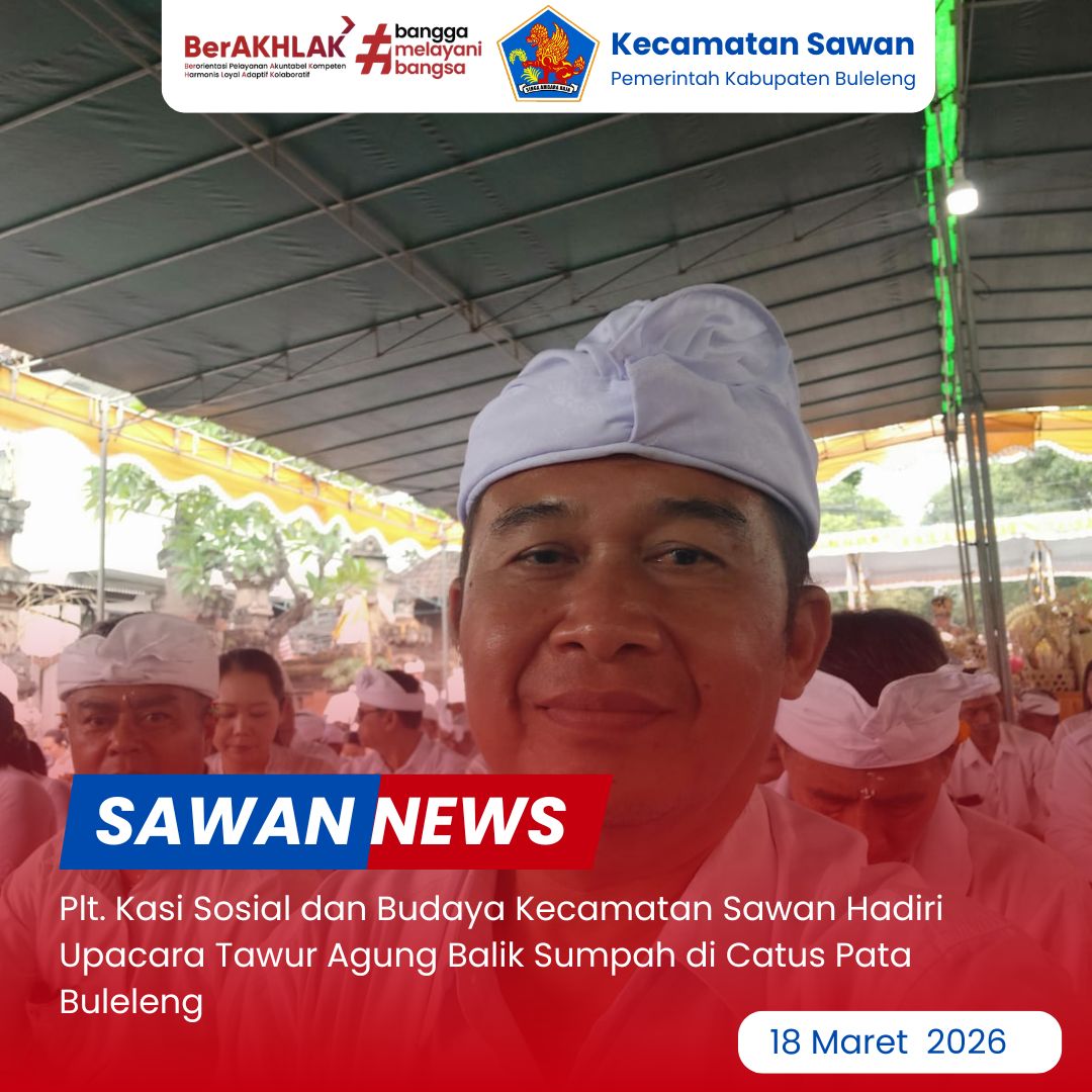 Hari ini Rabu, 18 Maret 2026, Pelaksana Tugas (Plt.) Kasi Sosial dan Budaya Kecamatan Sawan, Gede Mudiarsa, S.Sos, menghadiri pelaksanaan Upacara Tawur Agung Balik Sumpah yang berlangsung di Catus Pata Buleleng.