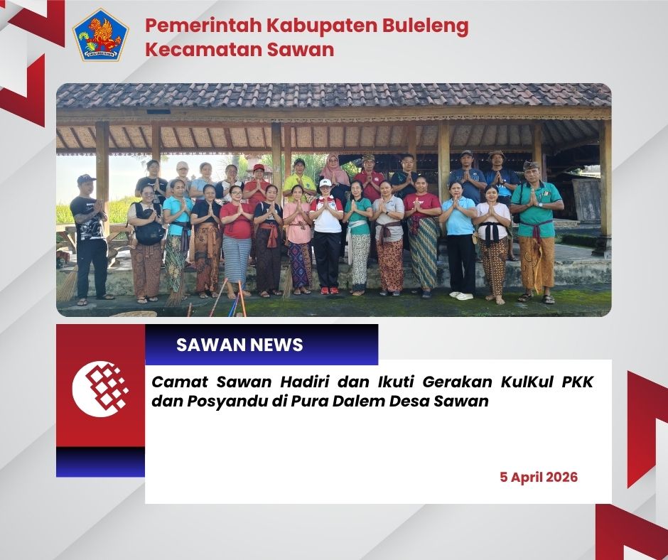 Hari ini Minggu, 5 April 2026 Camat Sawan I Ketut Cantyana, SP. dan Ketua TP. PKK Kec.Sawan Ny. Riang Cantyana melaksanakan kegiatan kulkul PKK dan Posyandu yang diselenggarakan oleh PKK bersama kader Posyandu bertempat di Pura Dalem Desa Sawan berlangsung dengan penuh semangat dan kebersamaan. Acara ini dihadiri oleh Ibu Kepala Dinas PMDPPKB dan staf selaku pengurus PKK Kabupaten Buleleng, Perangkat Desa Sawan serta Ibu PKK Desa Sawan.