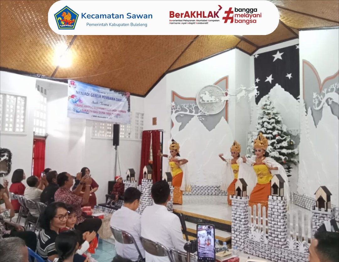 Hari ini selasa, 23 desember 2025 Kasi Sosial Budaya (Sosbud) Kecamatan Sawan I Gede Dana Yasa, S.Sos menghadiri Perayaan Malam Natal Tahun 2025 yang berlangsung khidmat di Gereja Imanuel Sangsit, Desa Sangsit, Kecamatan Sawan. Perayaan Natal tahun ini mengusung tema “Menjadi Gereja Pembawa Damai” dengan subtema “Terang Kristus Menyembuhkan dan Memberi Sukacita Bagi Dunia Yang Terluka”.