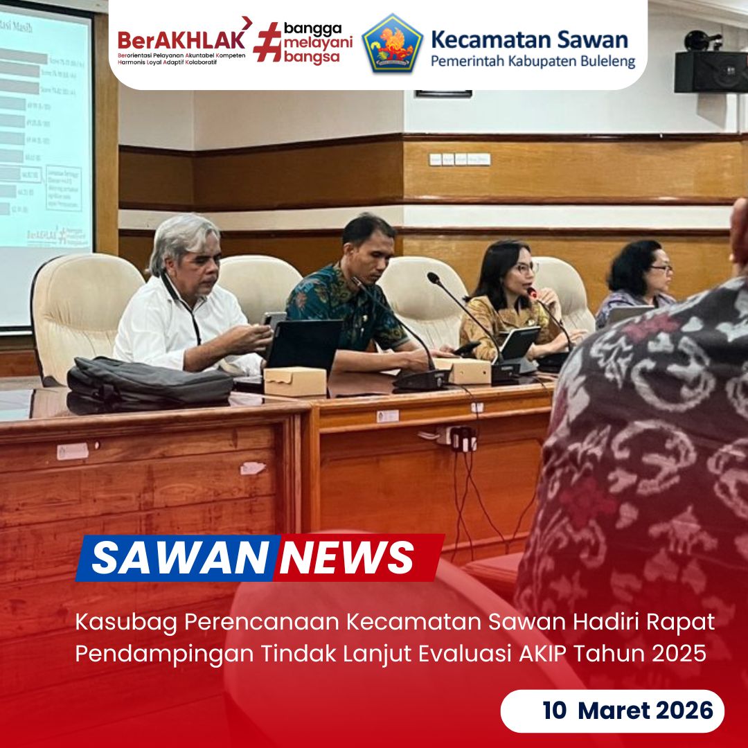 Hari ini Selasa, 10 Maret 2026, Kasubag Perencanaan Kecamatan Sawan Gede Mudiarsa, S.Sos menghadiri rapat Pendampingan Penyelesaian Tindak Lanjut Hasil Evaluasi Akuntabilitas Kinerja Instansi Pemerintah (AKIP) Tahun 2025 yang dilaksanakan di Ruang Rapat Unit IV Kantor Bupati Buleleng.