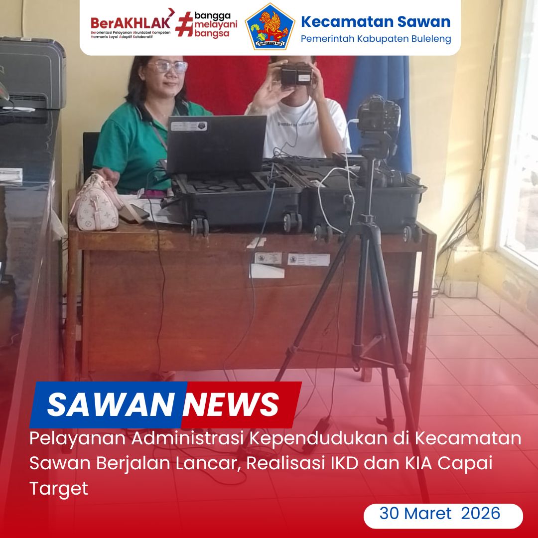 Hari ini Senin, 30 Maret 2026 Staf Kecamatan Sawan melaksanakan kegiatan pelayanan administrasi kependudukan berupa perekaman, percetakan, dan penerbitan Identitas Kependudukan Digital (IKD) serta Kartu Identitas Anak (KIA) di Kantor Camat Sawan.