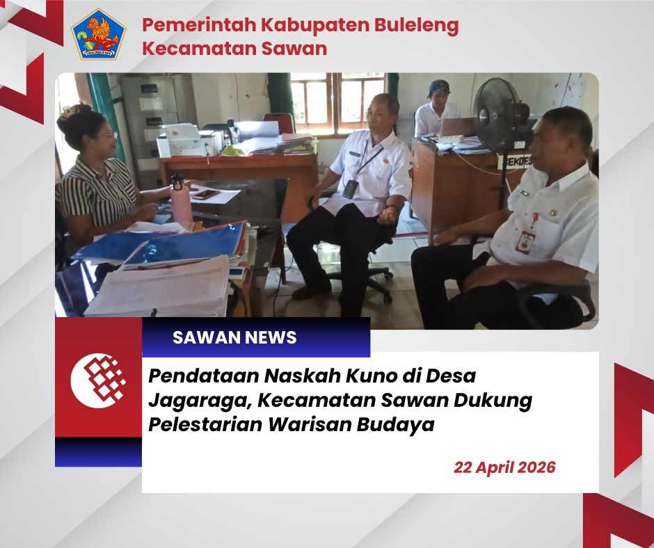 Hari ini Selasa, 22 April 2026, Staf Seksi Sosial dan Budaya Kecamatan Sawan melaksanakan pendampingan terhadap tim dari Dinas Arsip dan Perpustakaan Daerah Kabupaten Buleleng dalam kegiatan identifikasi dan pendaftaran naskah kuno di Desa Jagaraga.