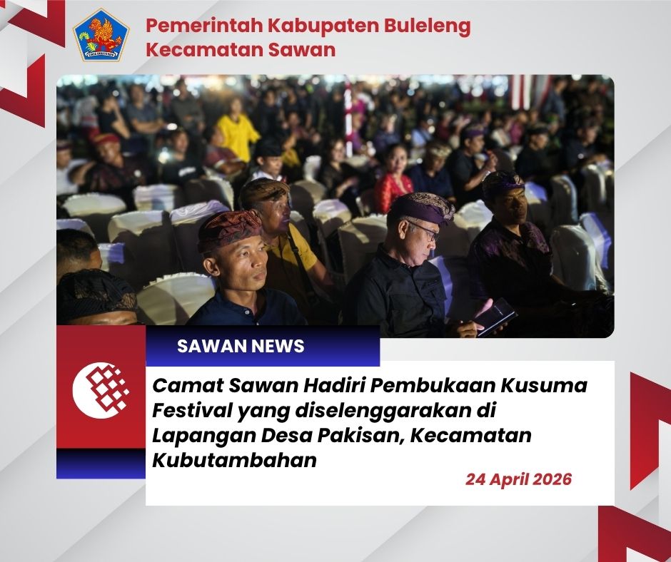 Hari ini Jumat 24 April 2026 Camat Sawan, I Ketut Cantyana, SP., menghadiri pembukaan Kusuma Festival yang diselenggarakan di Lapangan Desa Pakisan, Kecamatan Kubutambahan. Kegiatan ini berlangsung meriah dengan dihadiri langsung oleh Bupati Buleleng, I Nyoman Sutjidra, Sp.OG., bersama Wakil Bupati Buleleng, Gede Supriatna, S.H.
