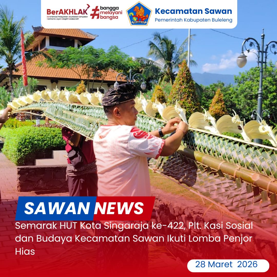 Hari ini Sabtu, 28 Maret 2026 dalam rangka menyambut Hari Ulang Tahun (HUT) Kota Singaraja ke-422 tahun 2026, Plt. Kasi Sosial dan Budaya Kecamatan Sawan, I Gede Mudiarsa, S.Sos bersama staf turut berpartisipasi dalam kegiatan lomba penjor hias yang dilaksanakan di RTH Taman Bung Karno.