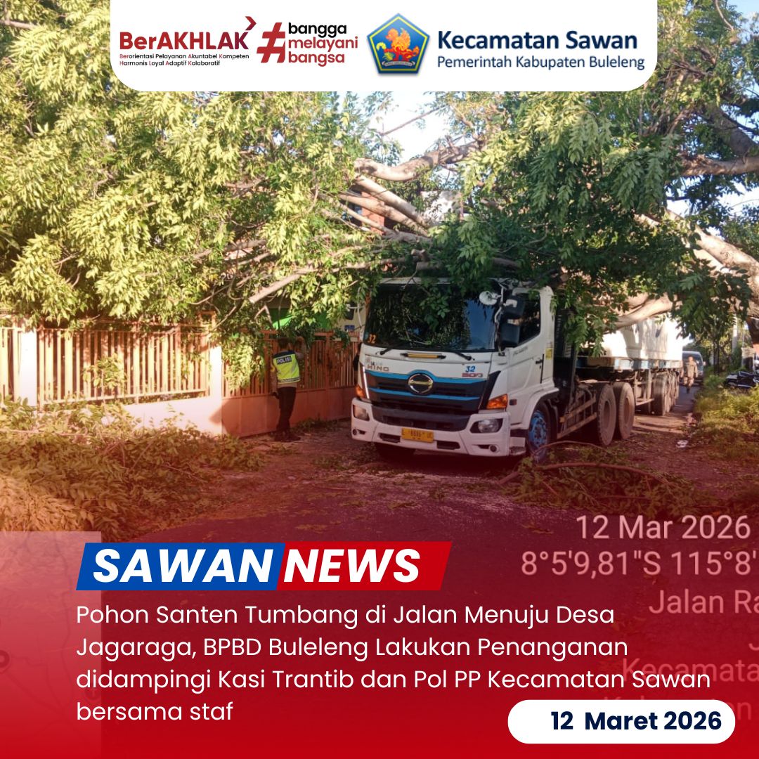Hari ini Kamis 12 Maret 2026 Kasi Trantib dan Pol PP Kecamatan Sawan Made Sutiastawa, SH bersama staf melaksanakan pendampingan terhadap anggota Badan Penanggulangan Bencana Daerah Kabupaten Buleleng (BPBD) dalam penanganan kejadian pohon tumbang di wilayah Kecamatan Sawan.