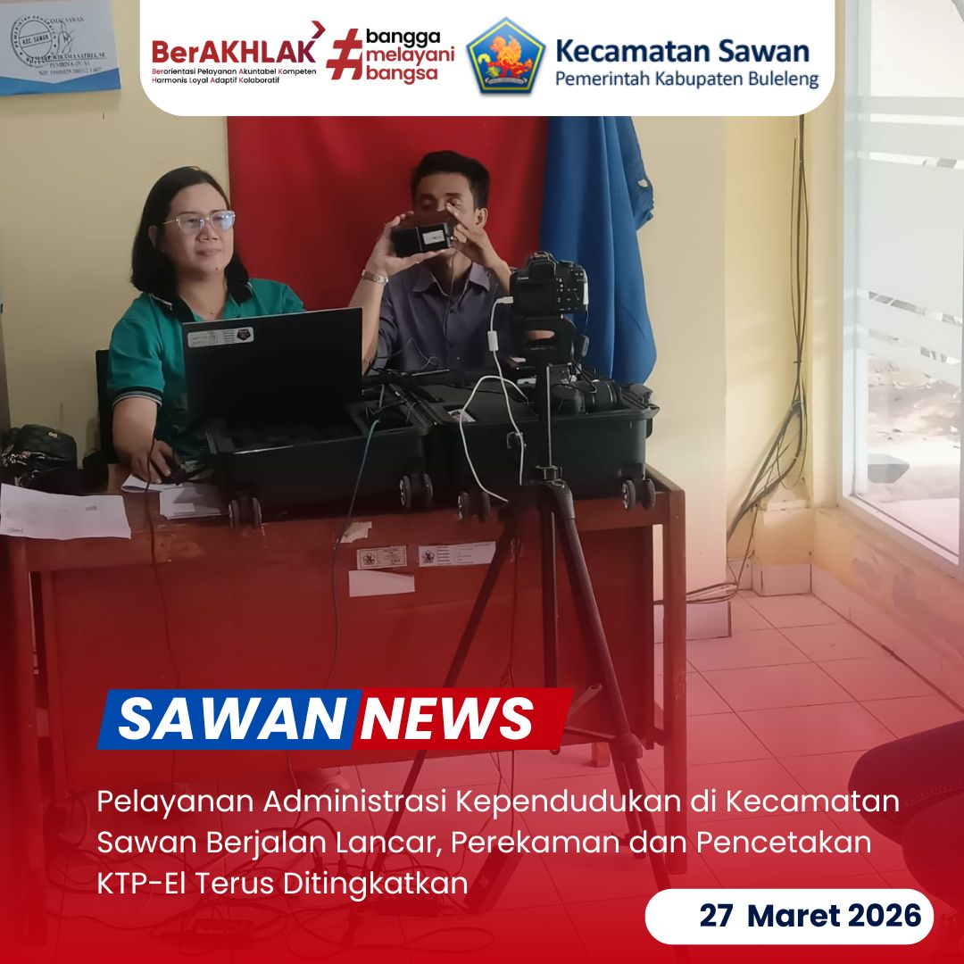 Hari ini Jumat, 27 Maret 2026, staf Kecamatan Sawan kembali melaksanakan pelayanan administrasi kependudukan berupa perekaman data, pencetakan KTP elektronik (KTP-El), serta pembuatan Identitas Kependudukan Digital (IKD) bagi masyarakat.