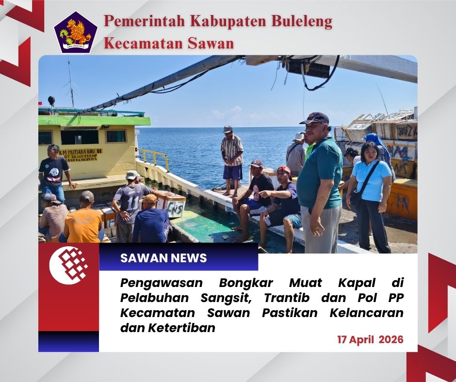 Hari ini Jumat, 17 April 2026 pukul 09.40 WITA, Kepala Seksi Ketentraman dan Ketertiban (Kasi Trantib) dan Satuan Polisi Pamong Praja Kecamatan Sawan, Made Sutiastawa, SH, bersama staf Trantib dan Pol PP Kecamatan Sawan melaksanakan kegiatan pemantauan terhadap proses bongkar muat kapal barang di jalur Madura – Pelabuhan Sangsit.