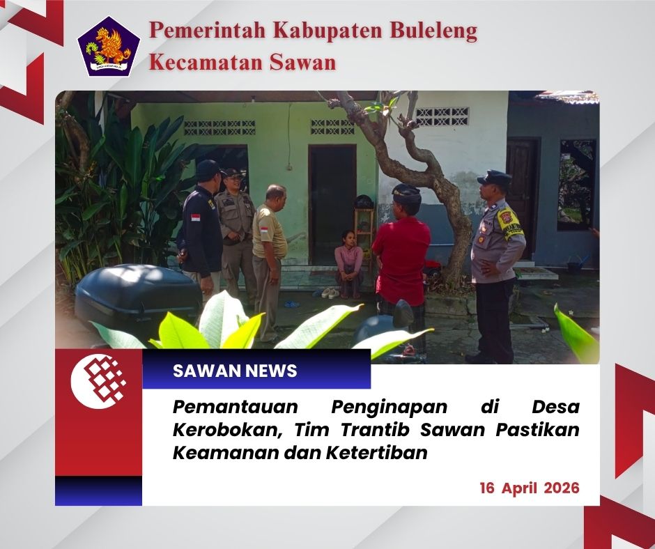 Hari ini Kamis, 16 April 2026, staf Seksi Ketentraman dan Ketertiban (Trantib) serta Satuan Polisi Pamong Praja (Pol PP) Kecamatan Sawan melaksanakan kegiatan pemantauan/sidak di wilayah Desa Kerobokan, Kecamatan Sawan. Kegiatan ini dilaksanakan bekerja sama dengan Bhabinkamtibmas, Babinsa, serta Kelian Banjar Dinas Segara.