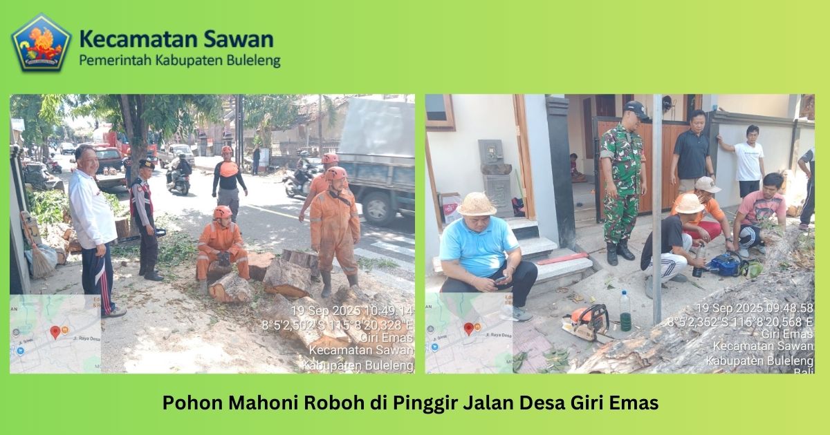 Hari ini jumat, 19 september 2025 Kasi Trantib dan Pol PP I Made Sutiastawa, SH bersama staf melakukan gotong royong karena adanya Pohon Mahoni tumbang di pinggir jalan raya Desa Giri Emas. Pohon tumbang yang disebabkan oleh akibat terserempet kendaraan truk besar dari arah barat menuju ke timur dan pohon mahoni tersebut sudah berusia tua.