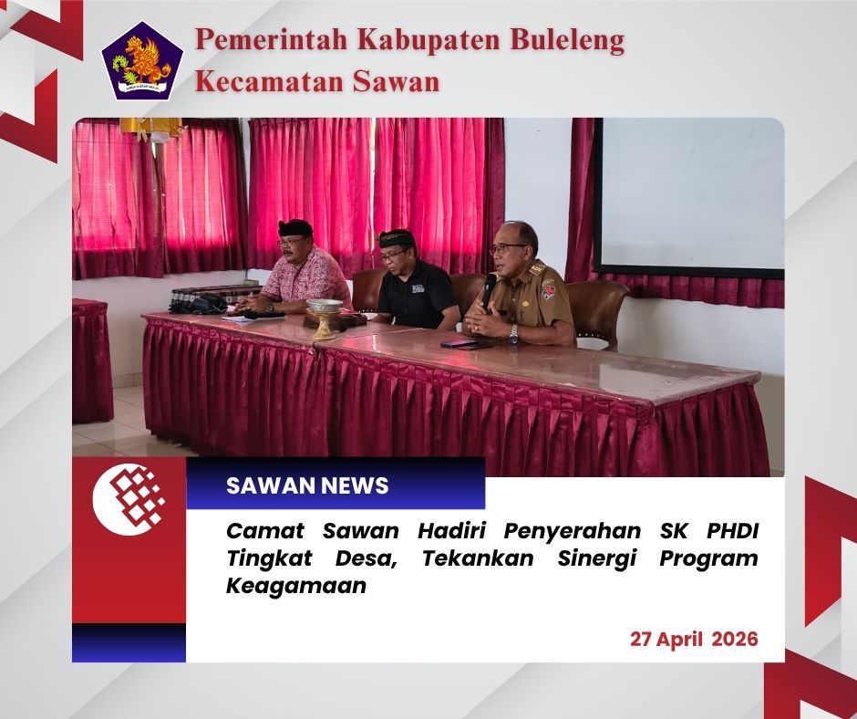 Hari ini Senin, 27 April 2026, Camat Sawan I Ketut Cantyana, SP didampingi Plt. Kasi Sosial dan Budaya Gede Mudiarsa, S.Sos menghadiri kegiatan penyerahan Surat Keputusan (SK) Parisada Hindu Dharma Indonesia (PHDI) tingkat desa yang berlangsung di Ruang Rapat Kantor Camat Sawan.