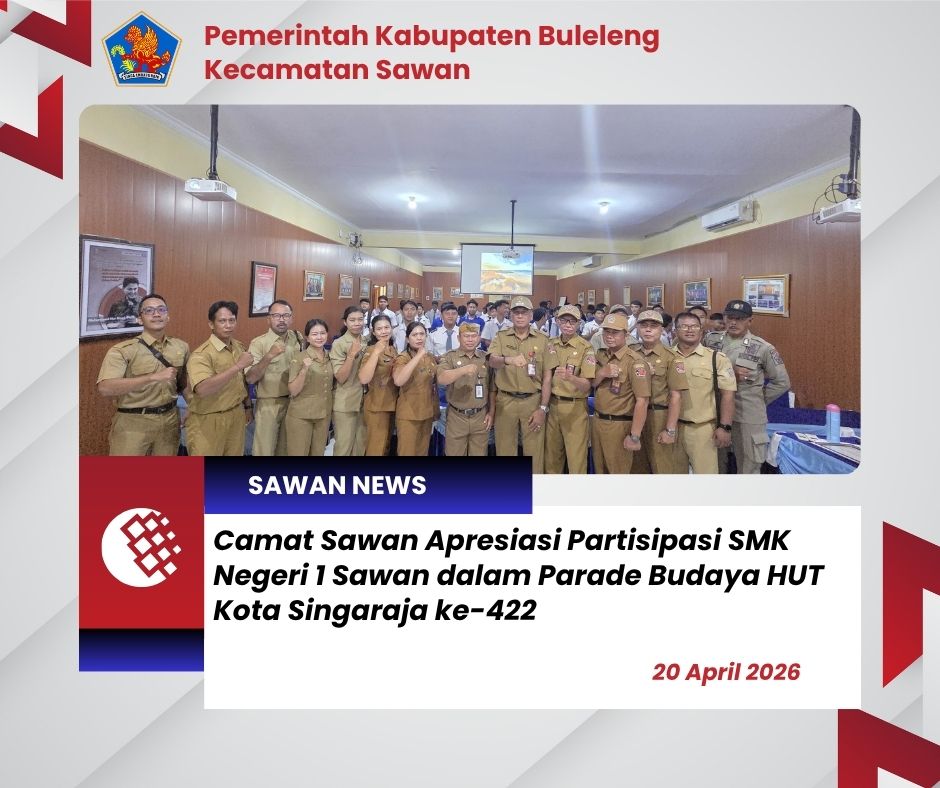 Hari ini Senin, 20 April 2026, Camat Sawan I Ketut Cantyana, SP bersama panitia parade budaya melaksanakan kunjungan ke SMK Negeri 1 Sawan sebagai bentuk apresiasi dan ucapan terima kasih atas partisipasi sekolah tersebut dalam kegiatan parade budaya memperingati Hari Ulang Tahun (HUT) Kota Singaraja ke-422.