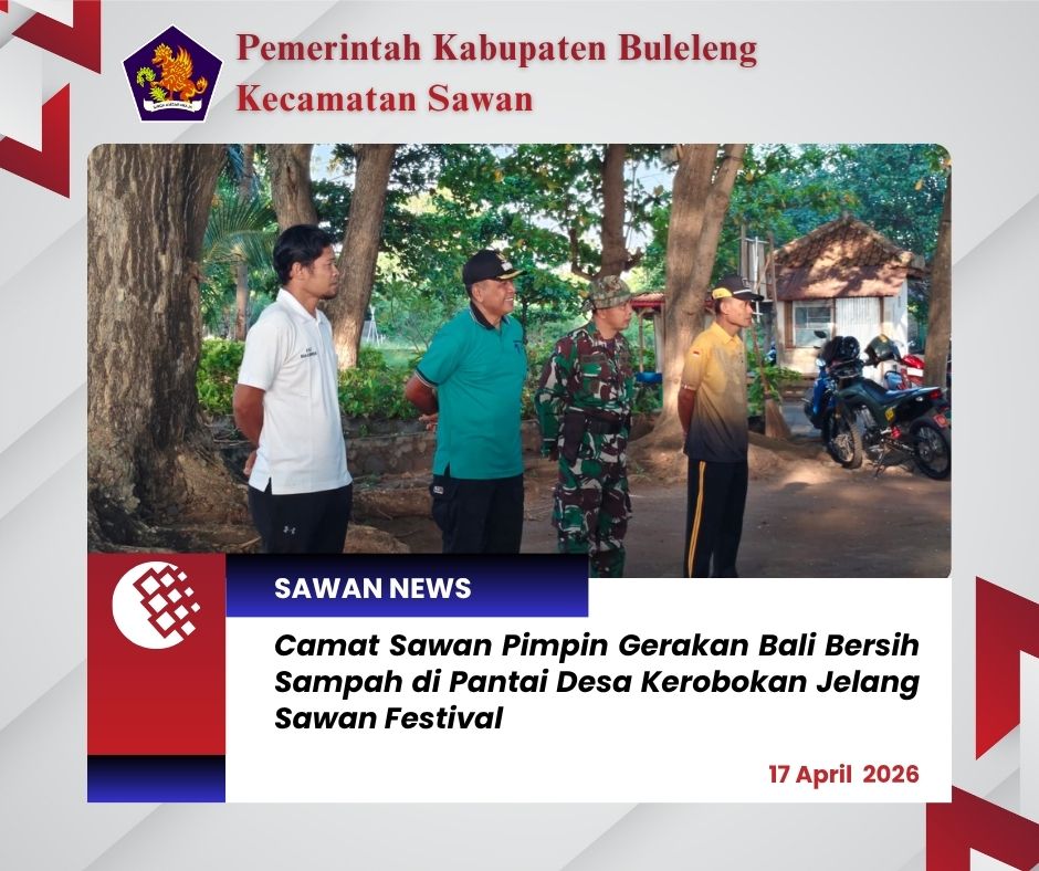 Hari ini Jumat, 17 April 2026 Camat Sawan, I Ketut Cantyana, SP, memimpin langsung kegiatan Gerakan Bali Bersih Sampah yang dilaksanakan di kawasan Pantai Desa Kerobokan, Kecamatan Sawan. Kegiatan ini merupakan wujud nyata komitmen bersama dalam menjaga kebersihan lingkungan sekaligus sebagai persiapan menyambut Sawan Festival.