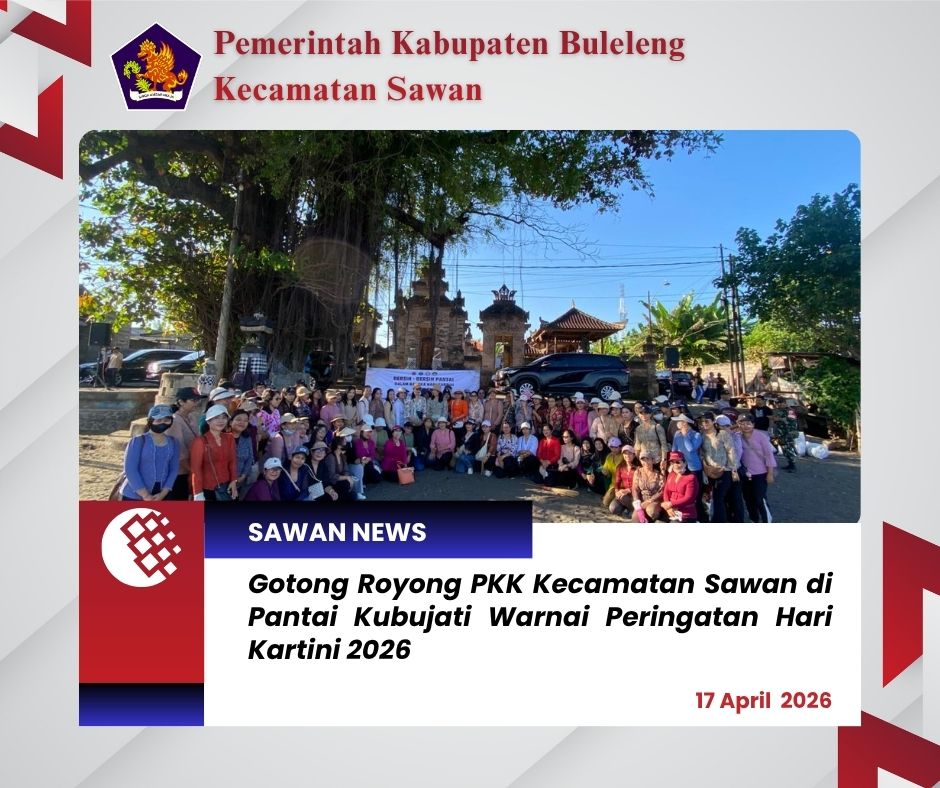 Hari ini Jumat, 17 April 2026, Pengurus PKK Kecamatan Sawan turut ambil bagian dalam kegiatan gotong royong yang dilaksanakan di Pantai Kubujati, Jalan Pulau Buton, Kecamatan Buleleng. Kegiatan ini diselenggarakan dalam rangka memperingati Hari Kartini Tahun 2026, sebagai bentuk kepedulian terhadap kebersihan lingkungan sekaligus semangat kebersamaan kaum perempuan.