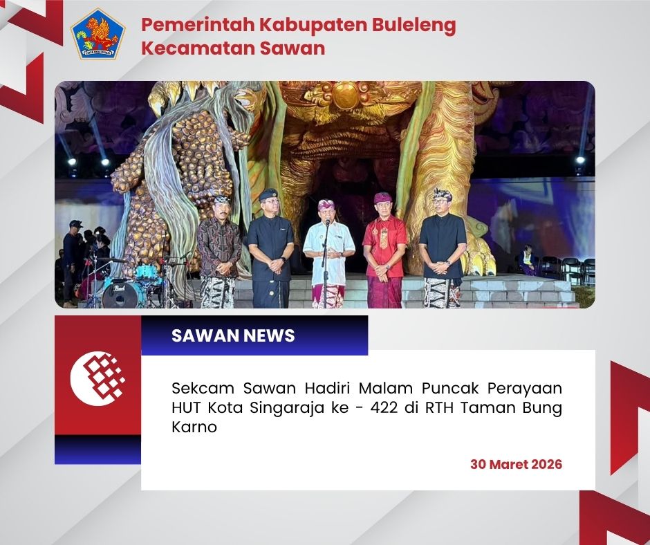 Hari ini Senin, 30 Maret 2026 Sekretaris Camat Sawan, Gde Agus Ngurah Suryawan, S.Sos, menghadiri malam puncak perayaan Hari Ulang Tahun (HUT) Kota Singaraja ke-422 yang digelar di RTH Taman Bung Karno. Kegiatan ini merupakan rangkaian penutup dari berbagai agenda perayaan yang telah berlangsung meriah dalam beberapa hari terakhir.
