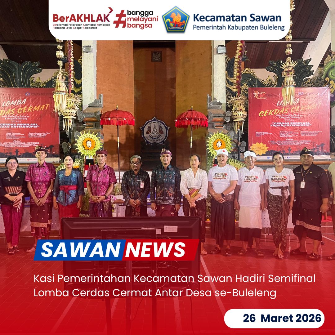 Hari ini Kamis, 26 Maret 2026, Kepala Seksi (Kasi) Pemerintahan Kecamatan Sawan, Made Suastika, S.Sos, menghadiri kegiatan semifinal lomba cerdas cermat antar perangkat desa se-Kabupaten Buleleng. Kegiatan ini dilaksanakan dalam rangka menyambut Hari Ulang Tahun Kota Singaraja ke-422, bertempat di SMK Negeri 3 Singaraja.