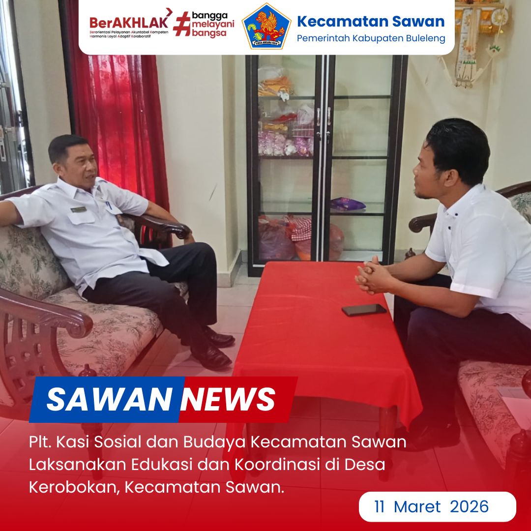 Hari ini Rabu, 11 Maret 2026, Plt. Kasi Sosial dan Budaya Kecamatan Sawan, Gede Mudiarsa, S.Sos melaksanakan kegiatan edukasi dan koordinasi di Desa Kerobokan, Kecamatan Sawan.