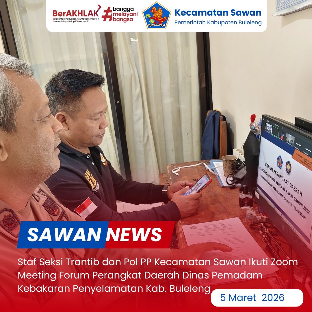 Hari ini Kamis, 5 Maret 2026 Staf Seksi Trantib dan Pol PP Kecamatan Sawan mengikuti Zoom Meeting Forum Perangkat Daerah dalam rangka Penyusunan Rencana Kerja (Renja) Tahun 2027 Dinas Pemadam Kebakaran dan Penyelamatan Kabupaten Buleleng. Kegiatan ini dilaksanakan sebagai sarana koordinasi, sinkronisasi, serta penajaman program dan kegiatan perangkat daerah.