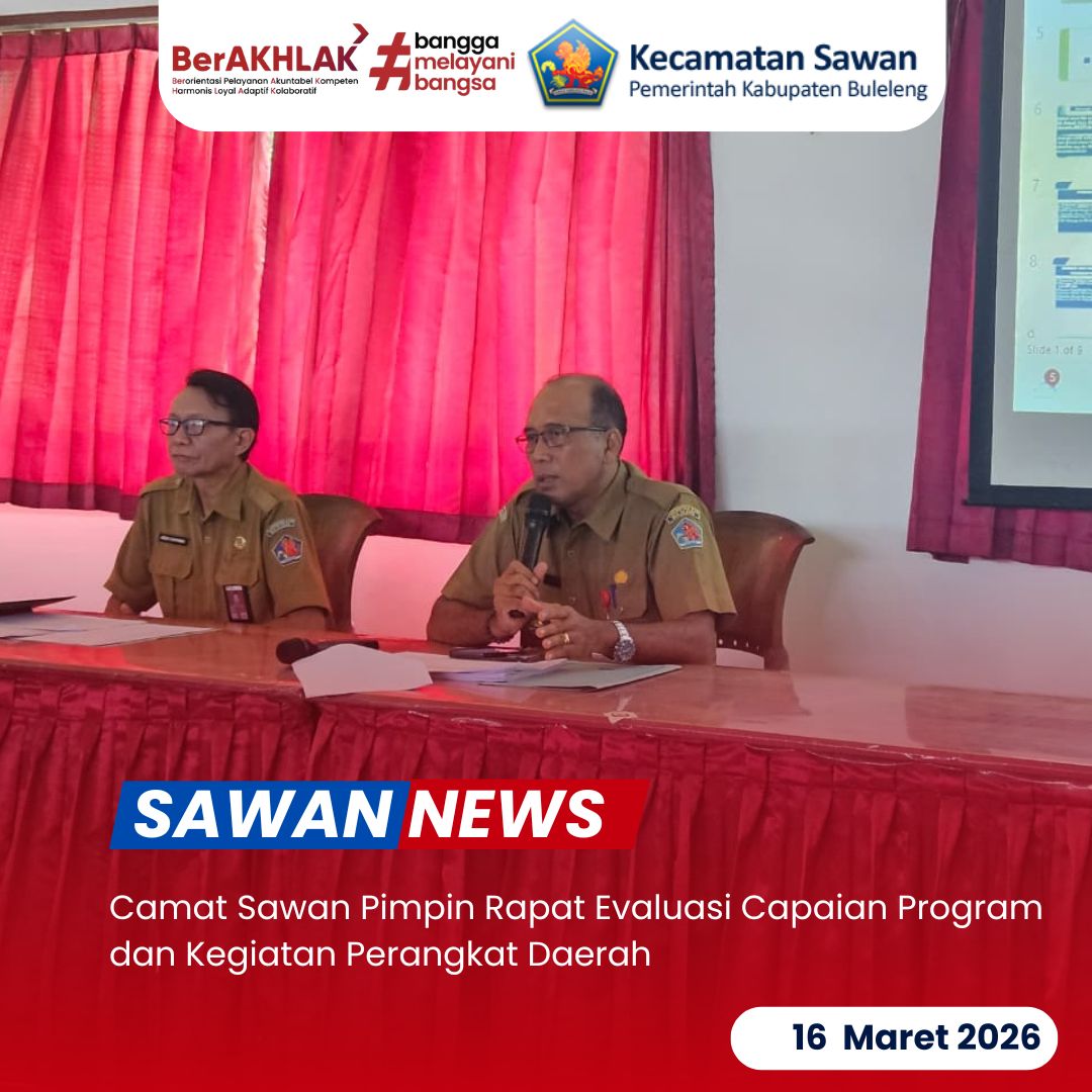 Hari ini Senin, 16 Maret 2026, Camat Sawan I Ketut Cantyana, S.P didampingi Sekretaris Camat (Sekcam) Sawan Gde Agus Ngurah Suryawan, S.Sos memimpin rapat terkait Laporan Capaian Pelaksanaan Program/Kegiatan Perangkat Daerah yang bertempat di Aula Kantor Camat Sawan.