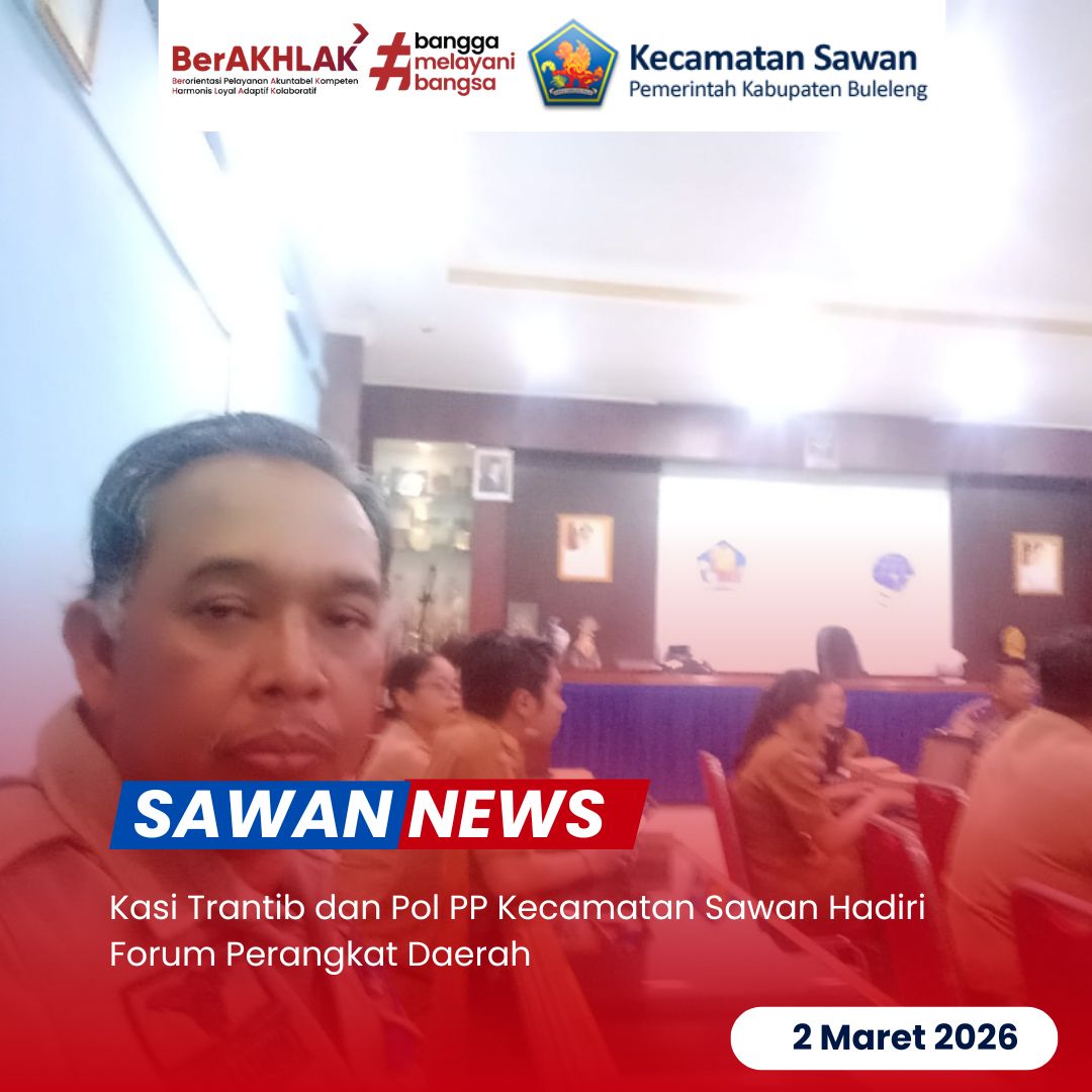 Hari ini Senin, 2 Maret 2026, Kasi Trantib dan Pol PP Kecamatan Sawan Made Sutiastawa, SH menghadiri undangan Forum Perangkat Daerah yang dilaksanakan di Ruang Rapat Dinas Perhubungan Kabupaten Buleleng. Forum tersebut membahas rencana program dan kegiatan dalam rangka Musrenbang Tahun 2027.