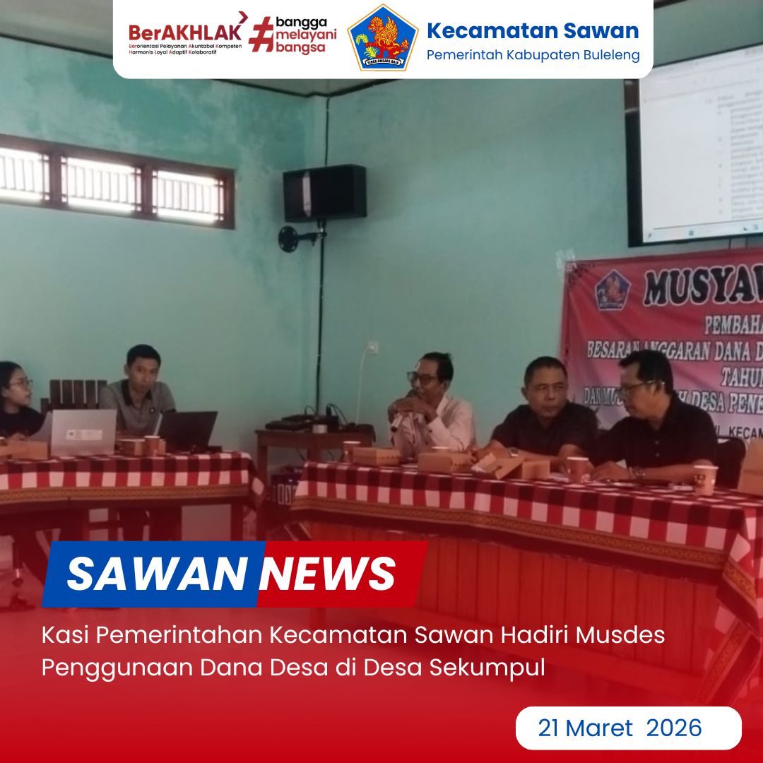 Hari ini Sabtu, 21 Maret 2026, Kasi Pemerintahan Kecamatan Sawan, Made Suastika, S.Sos menghadiri undangan Rapat Musyawarah Desa (Musdes) terkait penggunaan Dana Desa sesuai dengan PMK Nomor 7 Tahun 2026 yang dilaksanakan di Desa Sekumpul.