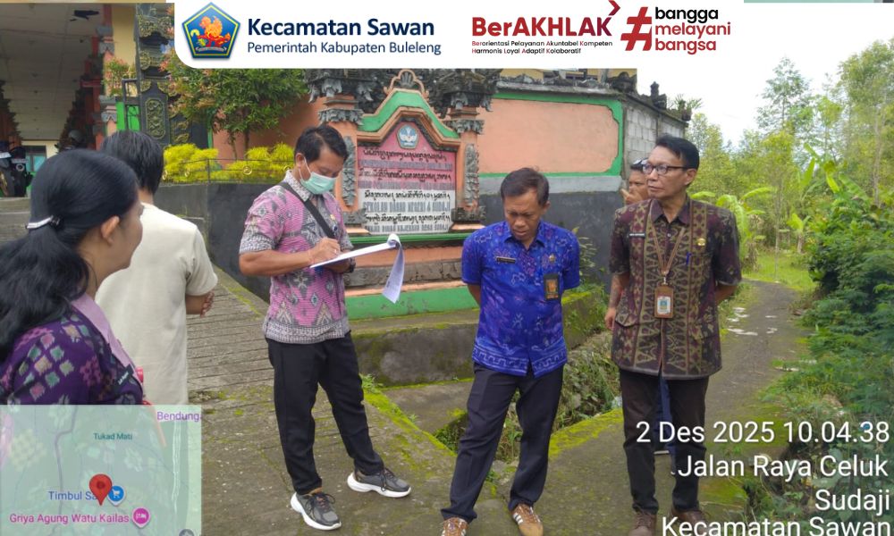 Hari ini selasa, 2 desember 2025 sekcam sawan Gde Agus Ngurah Suryawan, S.Sos bersama Plt. Kasi Pelayanan terpadu Luh Rupini, S.Sos bersama staf dari Dinas Lingkungan Hidup Kabupaten Buleleng melakukan pemantuan pencemaran lingkungan di sepanjang aliran got dari Pura Celuk Jero menuju SD 4 Sudaji di Banjar Dinas Kajekauh, Desa Sudaji.