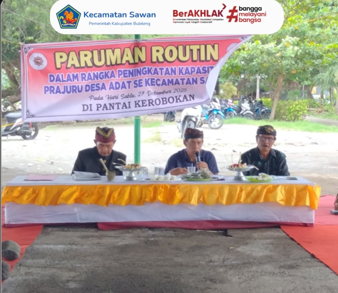 Hari ini Sabtu, 27 Desember 2025 Kasi Sosial dan Budaya Kecamatan Sawan I Gede Dana Yasa, S.Sos hadiri rapat rutin Kelian Desa Adat se-Kecamatan Sawan dalam rangka peningkatan kapasitas Kelian Desa Adat di wilayah kecamatan sawan yang bertempat di Pantai Desa Kerobokan.