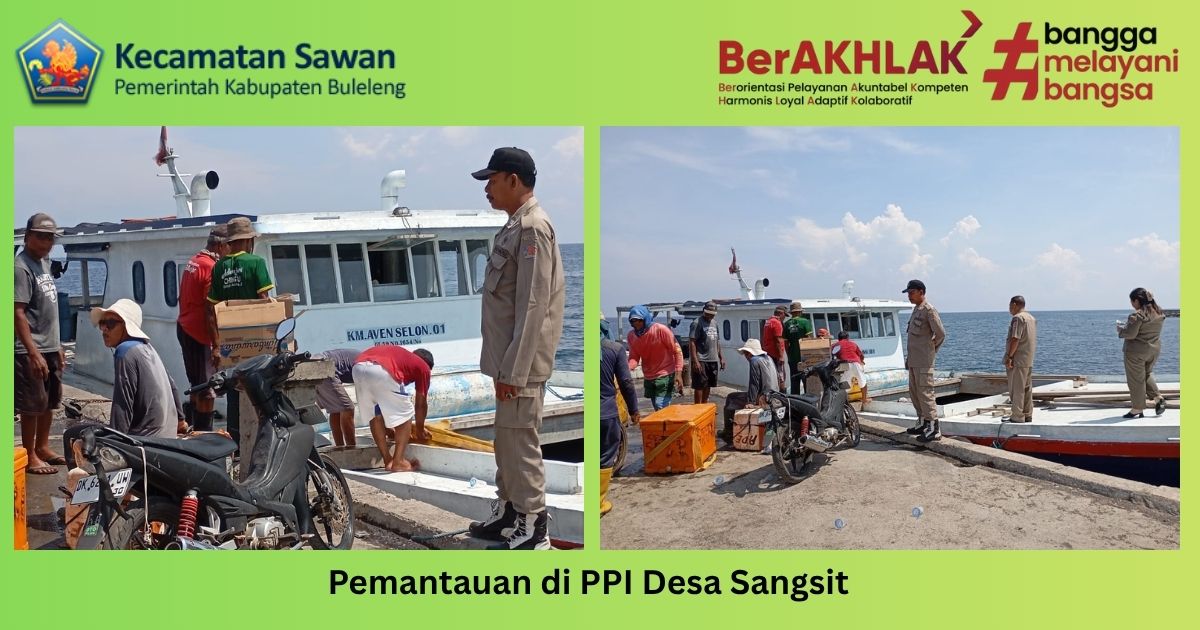 Hari ini rabu, 22 oktober 2025 staf seksi trantib dan pol pp kecamatan sawan melakukan pemantauan di PPI Desa Sangsit . Pemantauan dilakukan karena adanya kedatangan kapal dengan nama KM AVEN SELON 01 dari Madura ke PPI Desa Sangsit. Dari pemantauan, kapal mengangkut 4 anak buah kapal, 1 nahkoda kapal serta mengangkut kurang lebih 1 ton ikan, dengan bobot kpl kurang lebih 2 ton. Selain itu, petugas menghimbau ke nahkoda agar selalu memperhatikan kondisi cuaca sebelum melakukan pelayaran dan memastikan muatan tidak melanggar hukum.