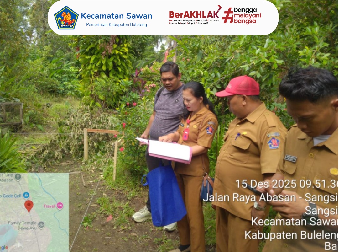 Hari ini senin, 15 desember 2025 Kasi Pelayanan Terpadu Kecamatan Sawan Luh Rupini, S.Sos bersama staf Seksi Trantib dan Pol PP Kecamatan Sawan melakukan survey lokasi pembangunan tower di banjar dinas abasan Desa Sangsit. Dalam survei tersebut didampingi langsung Kelian Banjar Dinas Abasan dan Kasi Pelayanan Desa Sangsit.