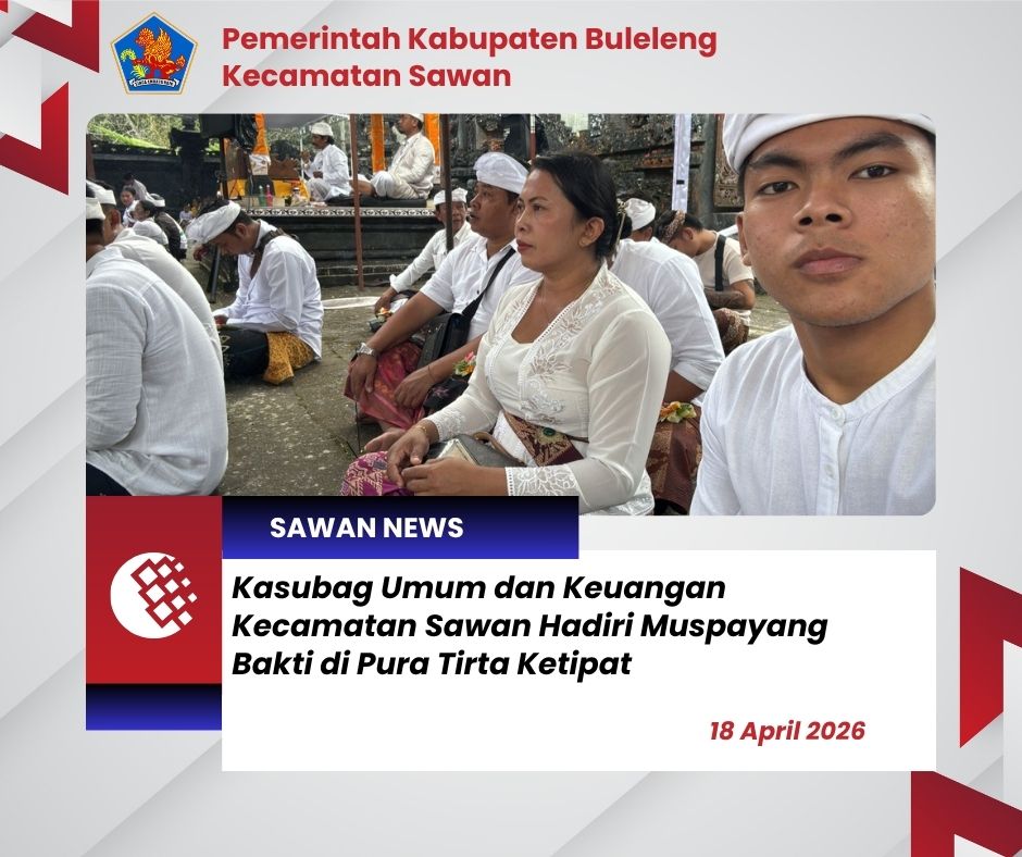 Hari ini Sabtu, 18 April 2026, Kasubag Umum dan Keuangan Kecamatan Sawan, Luh Karyani, S.Sos, menghadiri kegiatan muspayang bakti yang dilaksanakan di Pura Tirta Ketipat. Kegiatan persembahyangan ini berlangsung khidmat dengan dihadiri oleh berbagai unsur pemerintah dan masyarakat.