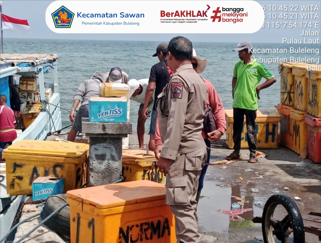 Hari ini, Rabu 18 Februari 2026 pukul 10.50 WITA, staf Seksi Ketentraman dan Ketertiban Umum (Trantib) dan Satuan Polisi Pamong Praja Kecamatan Sawan melaksanakan kegiatan pemantauan kapal bongkar muat jalur Madura–Singaraja yang berlangsung di PPI Desa Sangsit.