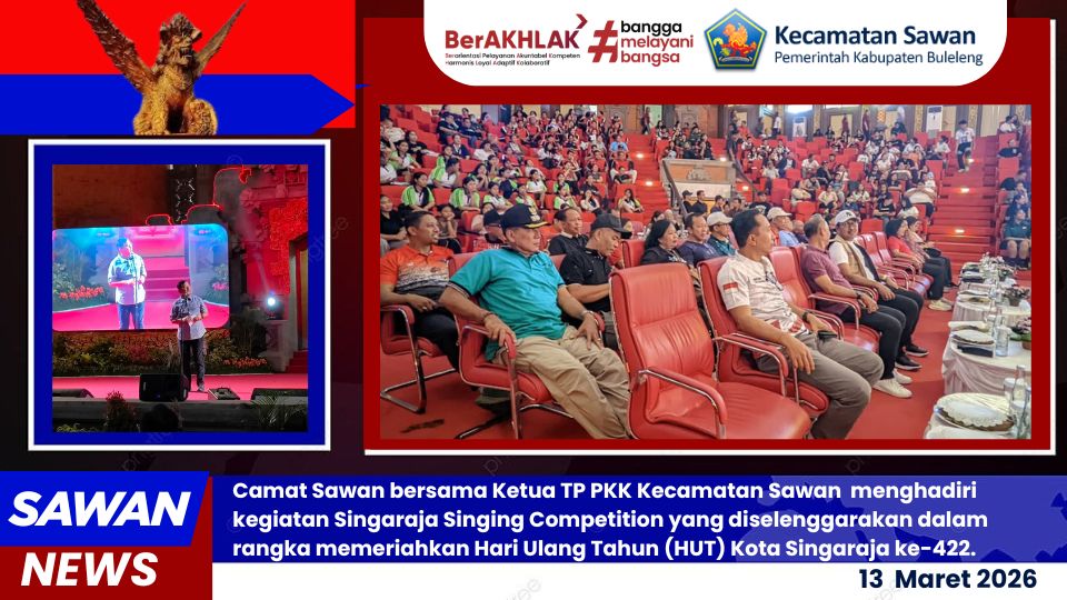 Hari ini Jumat, 13 Maret 2026 Camat Sawan I Ketut Cantyana, SP bersama Ketua TP PKK Kecamatan Sawan Ny. Riang Cantyana menghadiri kegiatan Singaraja Singing Competition yang diselenggarakan dalam rangka memeriahkan Hari Ulang Tahun (HUT) Kota Singaraja ke-422. Kegiatan tersebut melibatkan peserta dari SMA dan SMK serta perwakilan Organisasi Perangkat Daerah (OPD) Kabupaten Buleleng.
