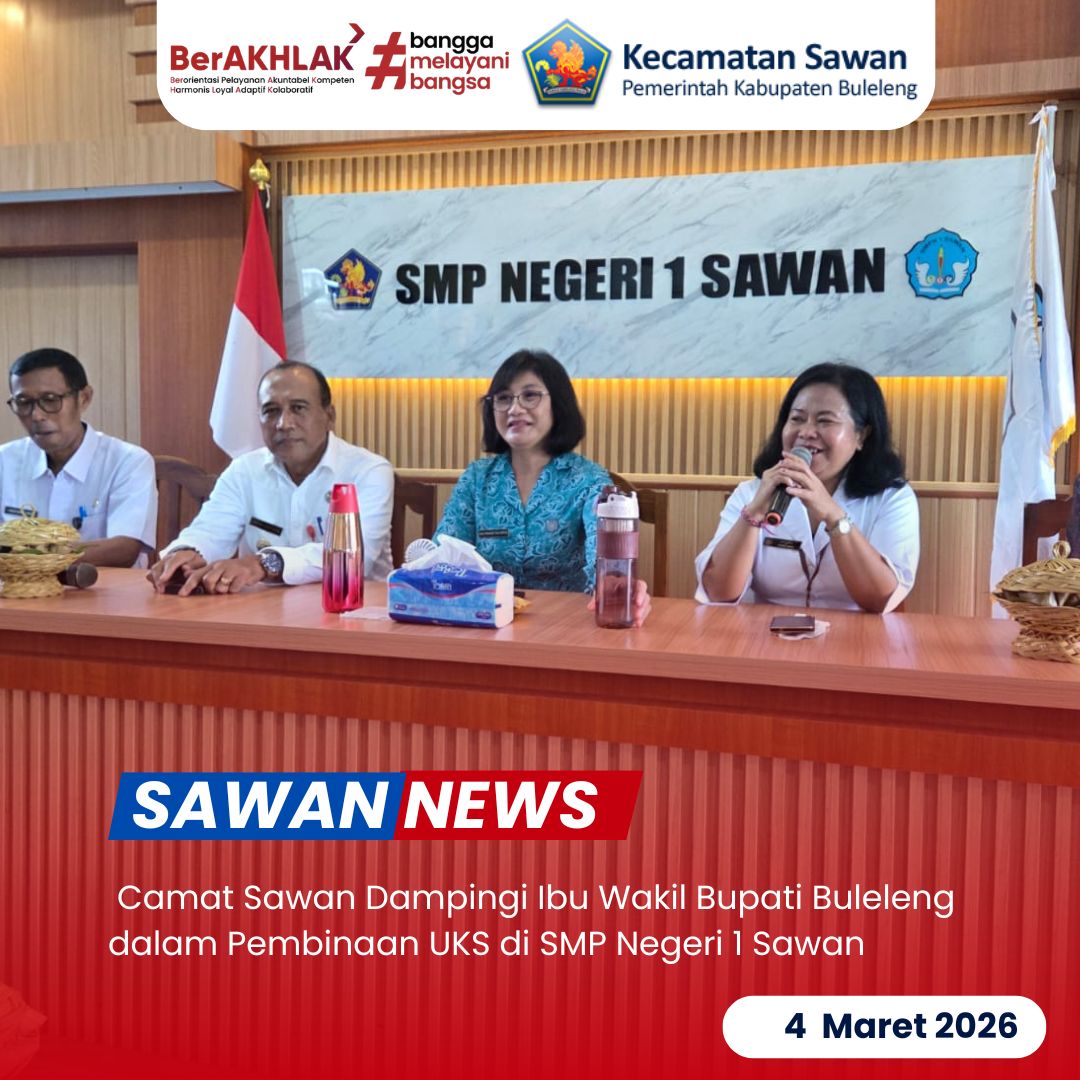 Hari ini Rabu, 4 Maret 2026 Camat Sawan I Ketut Cantyana, SP bersama Plt. Kasi Sosial dan Budaya Kecamatan Sawan Gede Mudiarsa, S.Sos mendampingi Ibu Wakil Bupati Buleleng Ny. Hermawati Supriatna serta Ibu Kabag Kesra Kabupaten Buleleng dalam kegiatan pembinaan Usaha Kesehatan Sekolah (UKS) di SMP Negeri 1 Sawan.