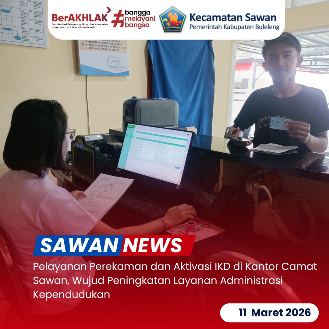 Hari ini Rabu 11 Maret 2026 Staf Kantor Camat Sawan melaksanakan kegiatan pelayanan perekaman dan pembuatan Identitas Kependudukan Digital (IKD) yang bertempat di Ruang Pelayanan Kantor Camat Sawan.