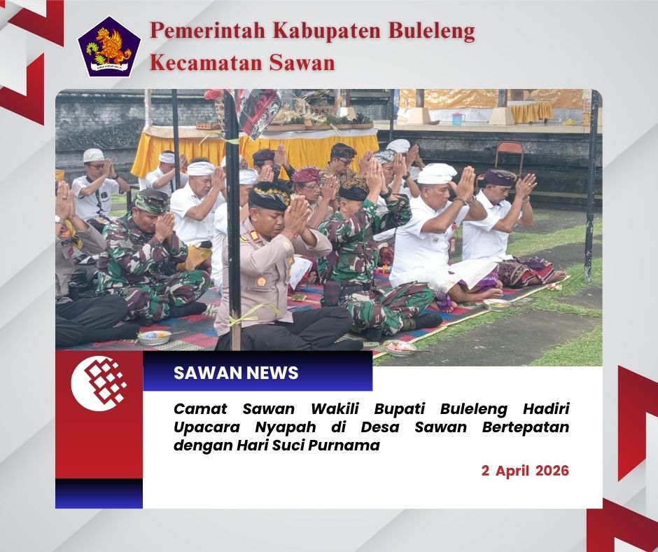 Hari ini Kamis, 2 April 2026 yang bertepatan dengan Hari Suci Purnama, Camat Sawan I Ketut Cantyana, SP didampingi Plt.Kasi Sosial dan Budaya Kecamatan Sawan I Gede Mudiarsa, S.Sos mewakili Bupati Buleleng menghadiri pelaksanaan Upacara Nyapah ( Ritual Nyapa Merta Desa / Menyambut Panen raya ) di Desa Sawan.