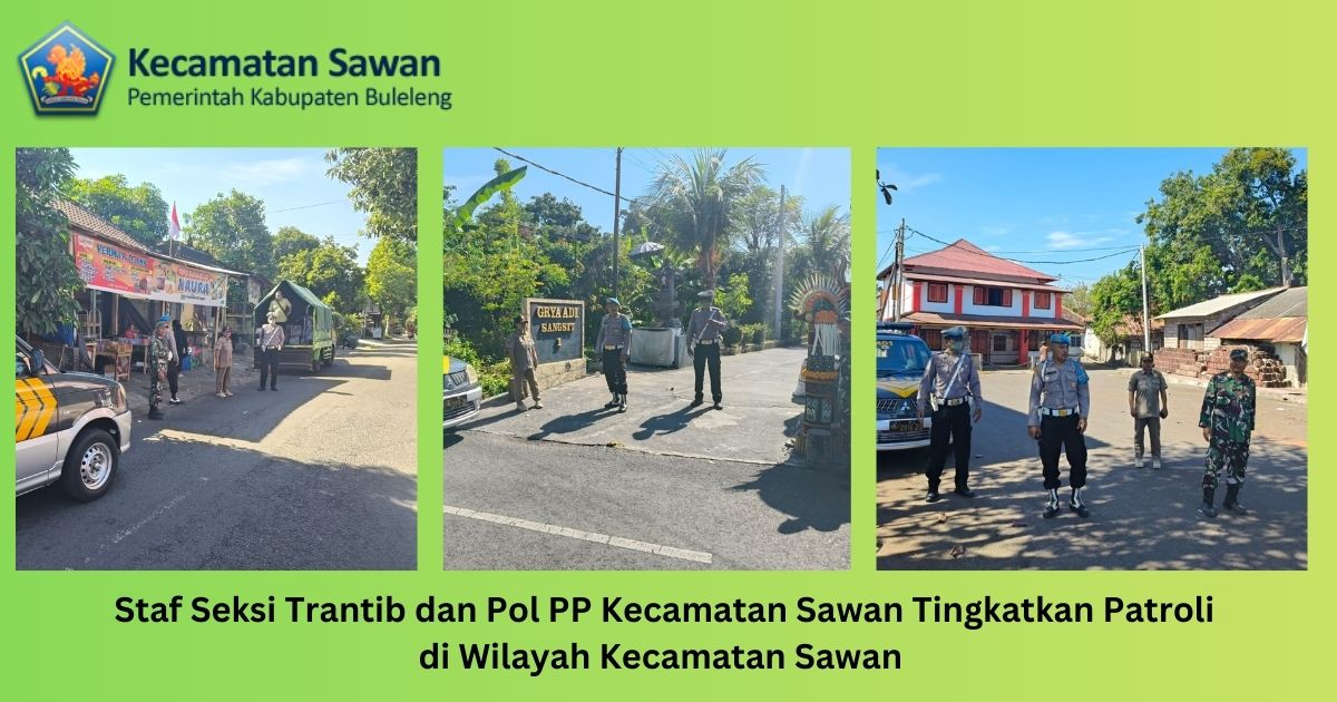 Hari ini kamis, 25 september 2025 Staf seksi trantib dan pol pp kecamatan sawan bekerja sama dengan anggota polsek sawan dan anggota koramil sawan melakukan kegiatan patroli serta sambang wilayah dan dialogis dengan warga yang berada di wilayah kecamatan sawan. Adapun wilayah yang dipatroli hari ini diantaranya depan kantor koramil sawan, pelabuhan PPI Desa Sangsit, perumahan griya sangsit.