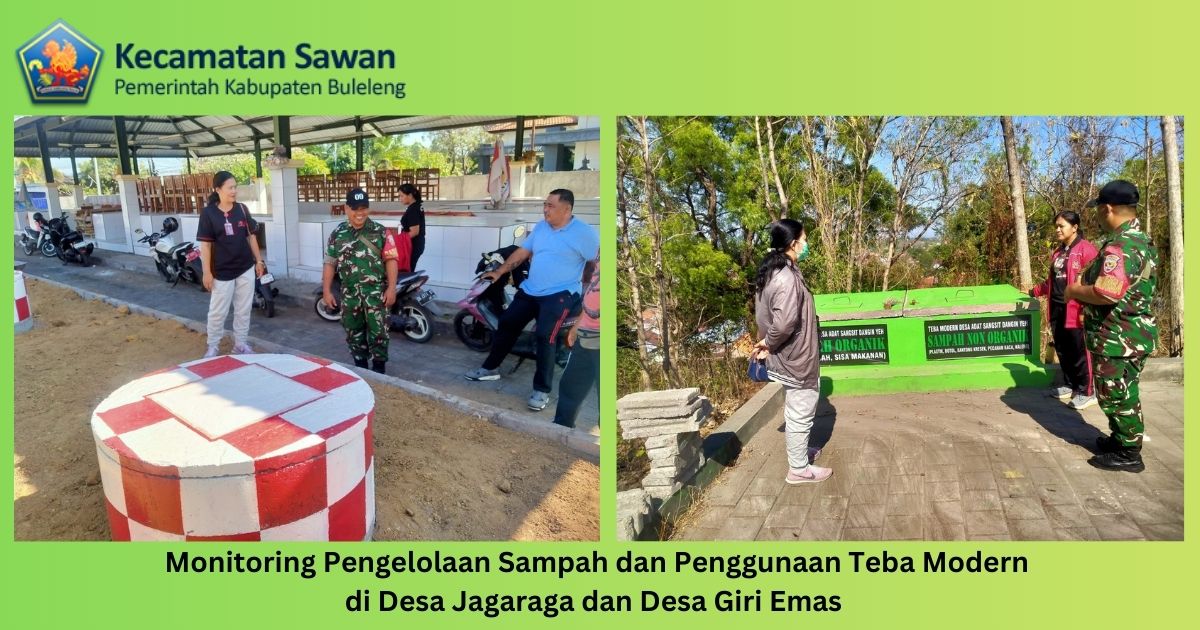 Hari ini jumat, 19 september 2025 Plt. Kasi Pelayanan Terpadu Kecamatan Sawan Luh Rupini, S.Sos bersama staf melaksanakan monitoring pengelolaan sampah dan pembuatan teba modern di Desa Jagaraga dan Desa Giri Emas. Dalam kegiatan ini dilakukan monev terhadap pelaksanaan pembatasan penggunaan plastik sekali pakai dan pengelolaan sampah berbasis sumber serta proses pembuatan dan penggunaan teba modern. Dalam monitoring diterima langsung perbekel, perwakilan dari desa adat dan perangkat desa di kedua desa.